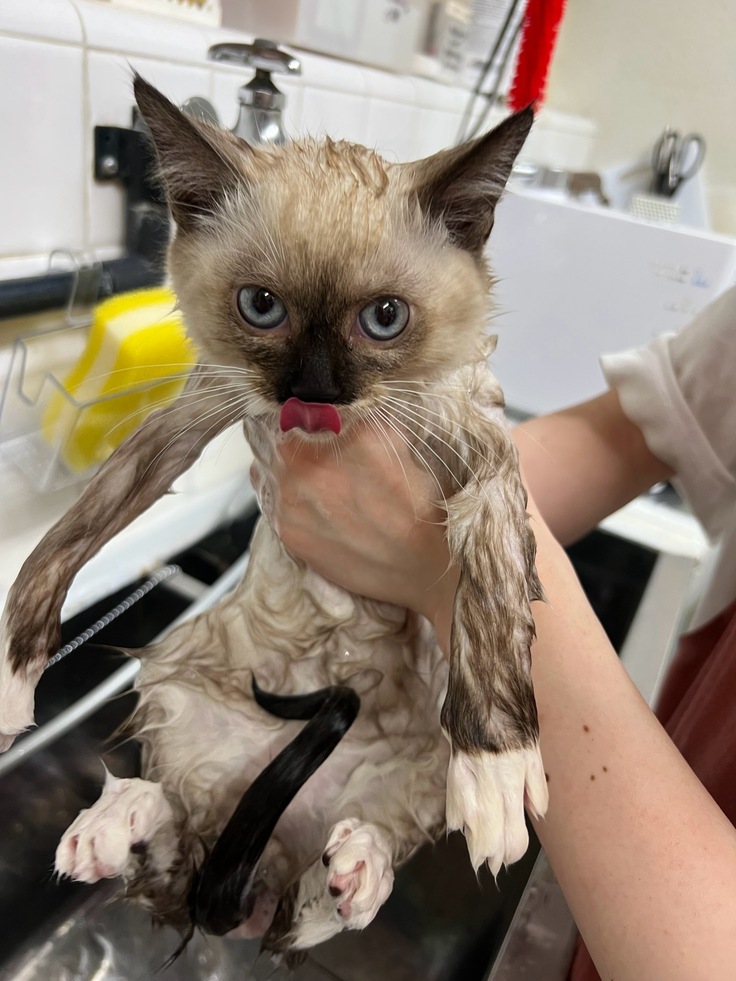 最初に動物病院に行き、便の検査、血液検査などなどをします。戻ってきたらシャンプーです。