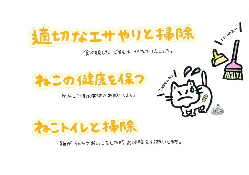 ご飯やトイレの掃除、怪我や病気の際には動物病院へなど