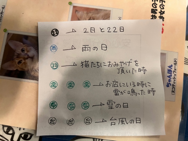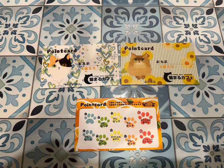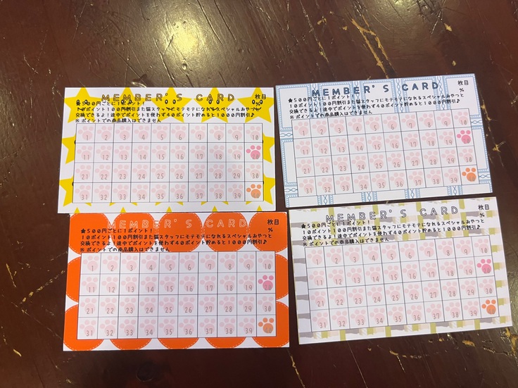 推しがいる方は次のカードに移るときに推しの猫スタッフを言っていただければその子で発行しています。また使用済みのポイントカードは持ち帰ることができるので保存してコレクションにしてくださっている方も多いです。