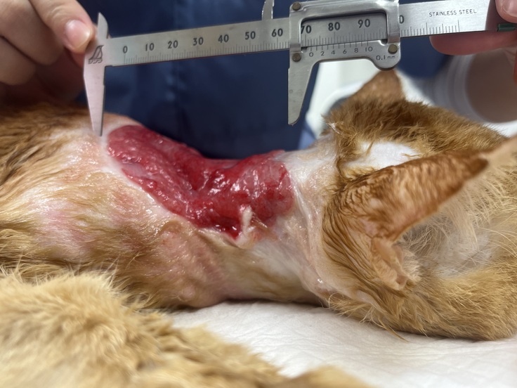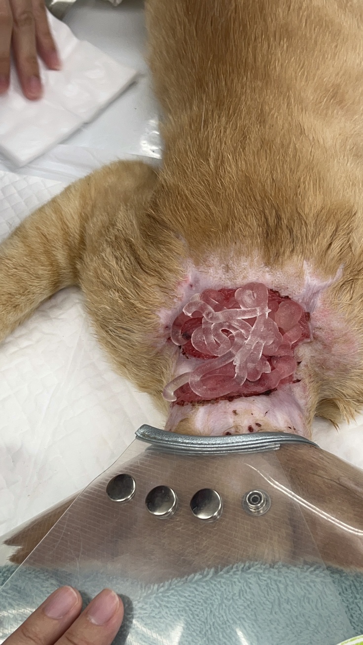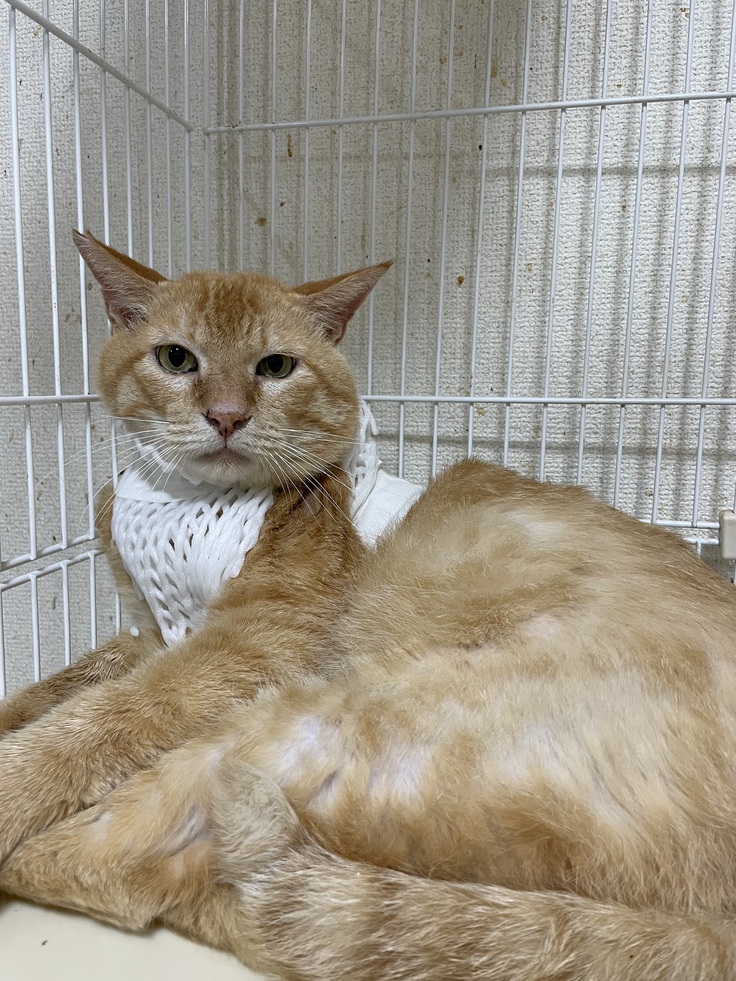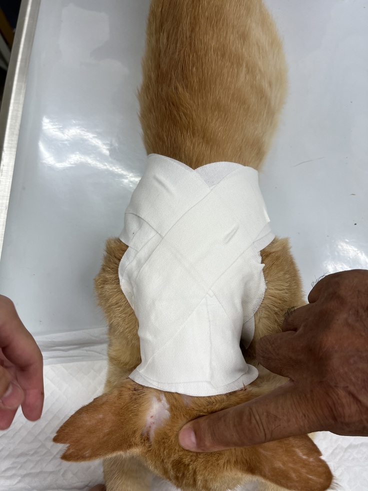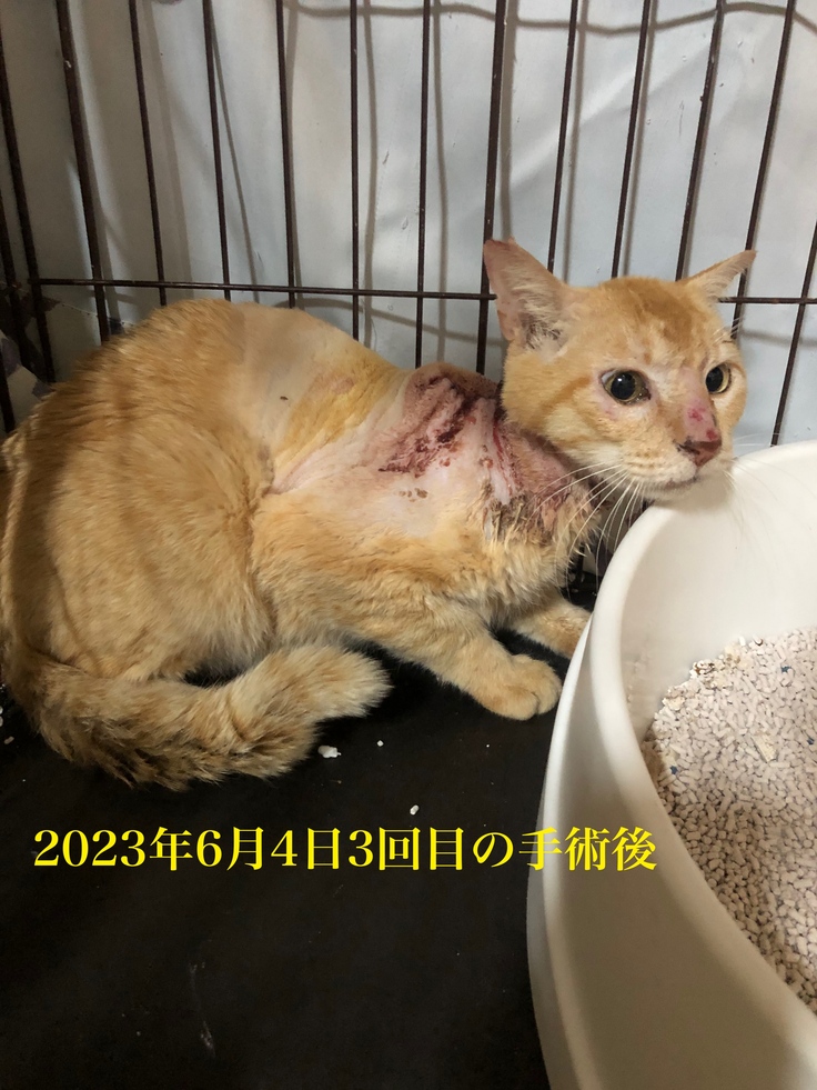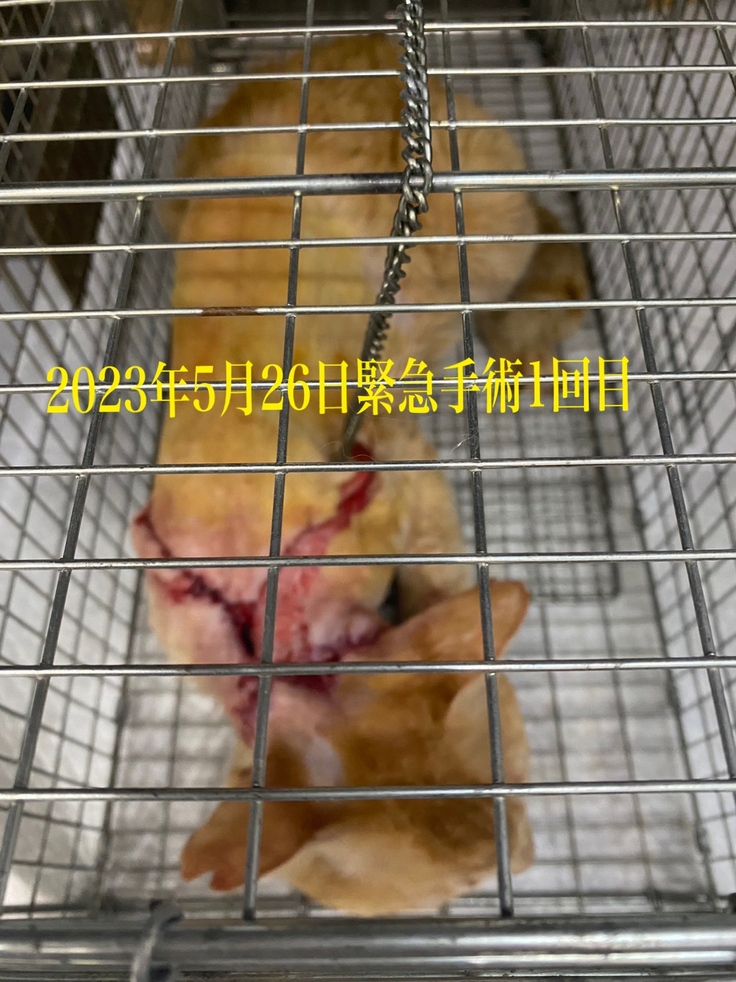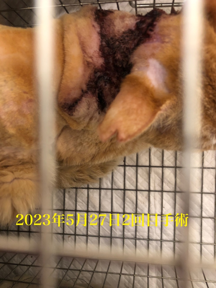 2023年5月26日緊急手術その際に、去勢手術もしてもらい、猫エイズウイルス感染症(FIV)と猫白血病ウイルス感染症(FeLV)の検査も行いました。どちらも、幸いにも陰性でした。翌日、縫合したにも関わらず、可動域な場所なので傷口が一部開いてしまったので、再手術となりました。