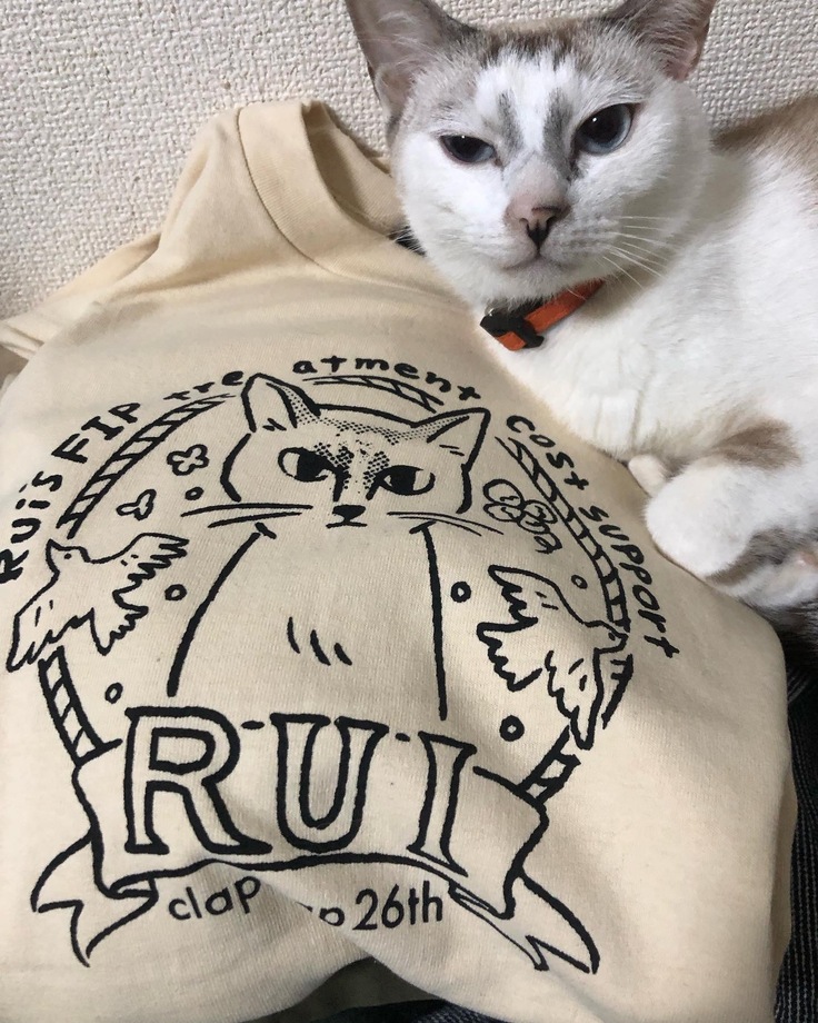 FIPの治療費の為に作成してくれたTシャツこの子の治療費とマイコーの治療費用を捻出する為、ダブルワークで治療費を作っていました。保護活動の仲間がチャリティーTシャツをワークショップを開催して、手術費用募ってくれました。