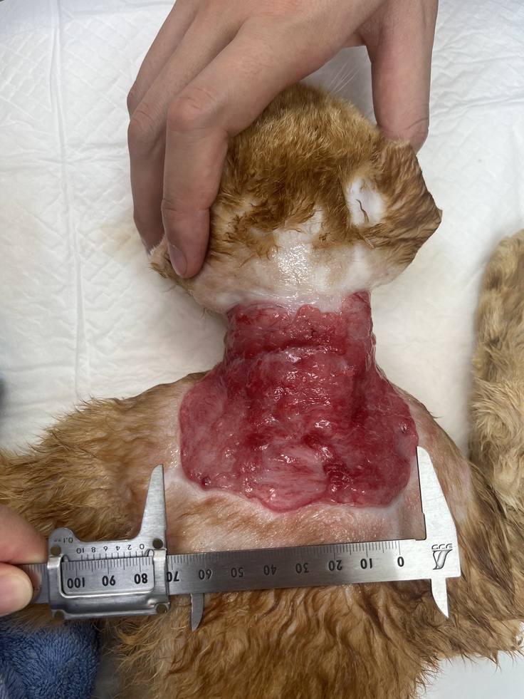 2回目の手術から、1週間してご飯を食べているマイコーの首を見ると、傷口がパックリ開いているのに気が付きました。