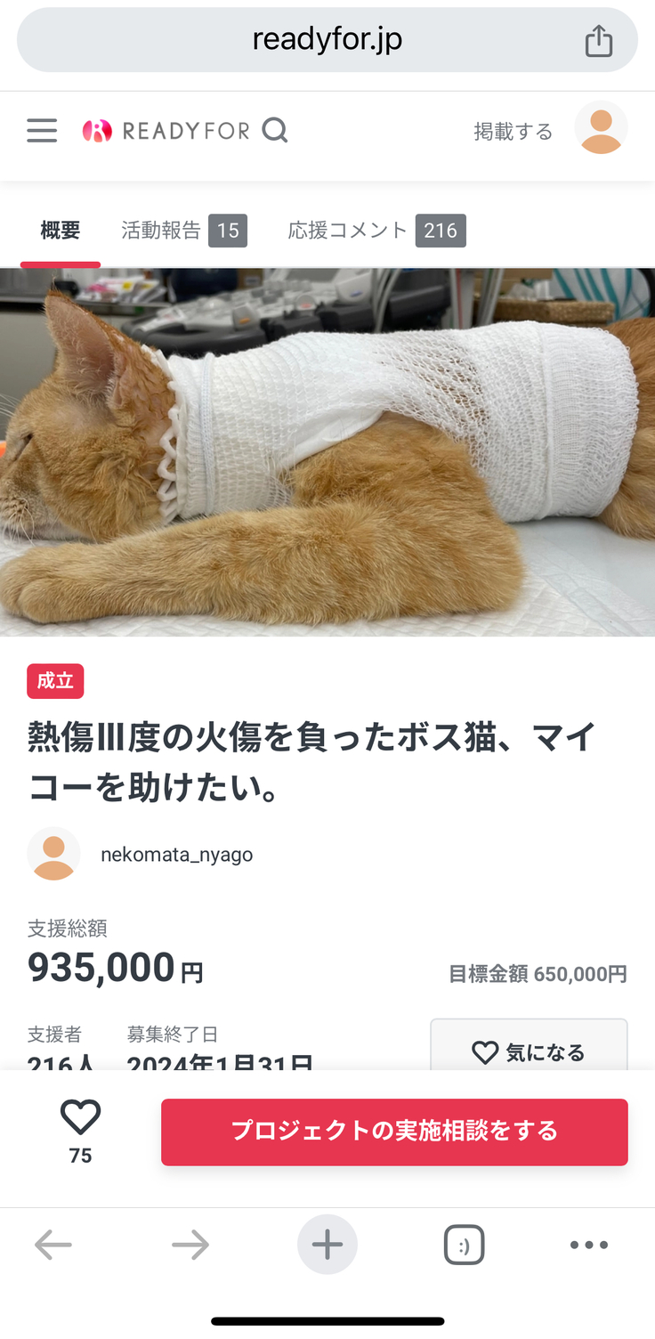 1月14日に行った手術以降の手術費用、経過観察と治療費約250,000円は、このご支援金より充当させて頂き、残りについては今後の治療費や新しく購入するケージ、ご飯や猫砂費用などに使わせて頂きます。