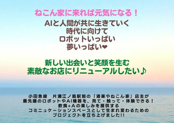 そこで、店舗の一部を改装し、様々なロボットと触れ合えるシェアスペースを設け、飲食+AI体験という新しい楽しさを提供したいと考えています。