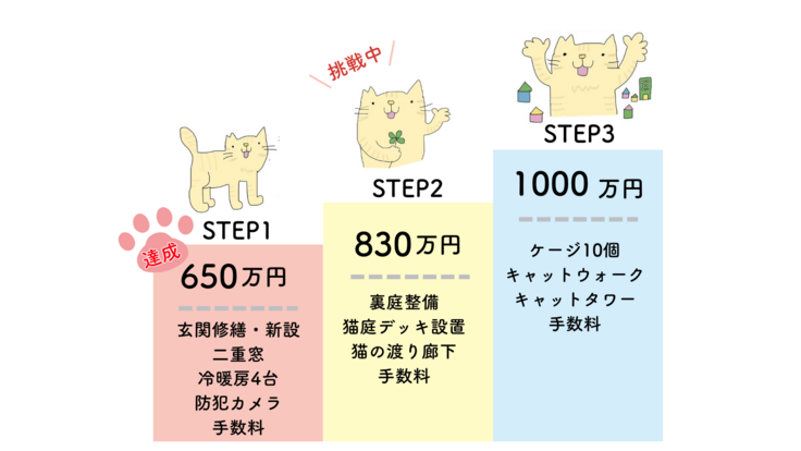 第一目標の500万円では「開放型シェルター」をオープンするために最低限必要な内装メインの修繕費用を募らせていただきました。現在挑戦中のネクストゴールでは、保護猫たちにとってより安全に、健康面に配慮した環境を整えていきたいと考えています。