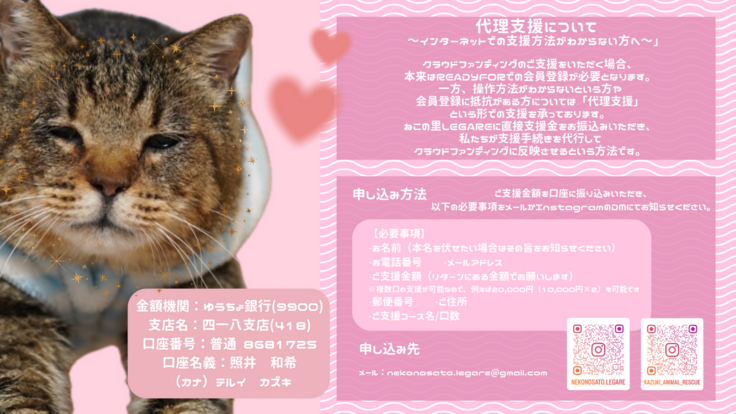 一方、操作方法が分からないという方からは、「代理支援」という形での支援も承っています。ねこの里LEGAREに直接支援金をお振込みいただき、ねこの里LEGAREが支援手続きを代行してクラウドファンディングに反映させるという方法です。
