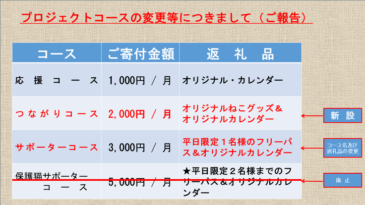 このコースは、保護猫たちと皆様をつなぐ支援の輪をイメージして設けたものです。また、3,000円コースの内容を見直し、より利用しやすくしました。