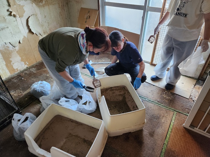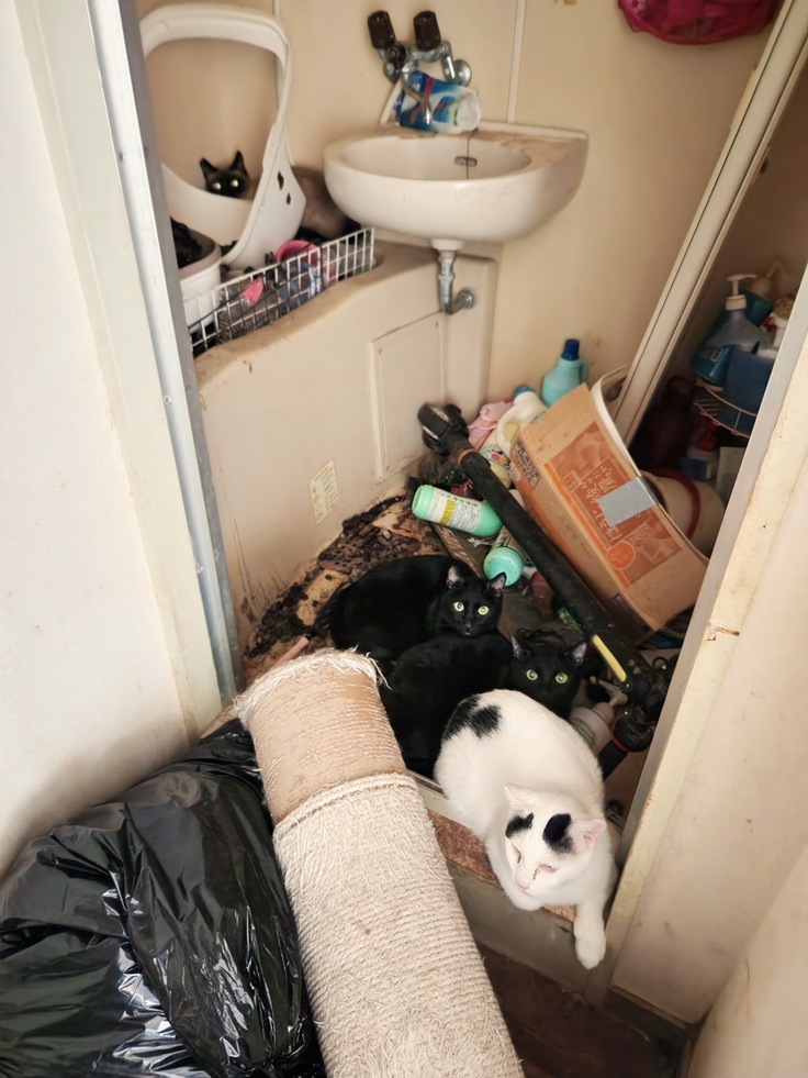 猫たちは砂のないトイレも使っていますが、他にも家のあちこちが糞尿まみれです。