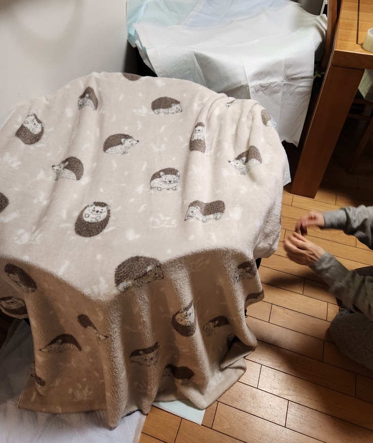 下の写真は預かりさん宅のリビングにて、ネットゲージを並べている様子です。寒さ対策と、他にも猫がいるためブランケットをかけています。