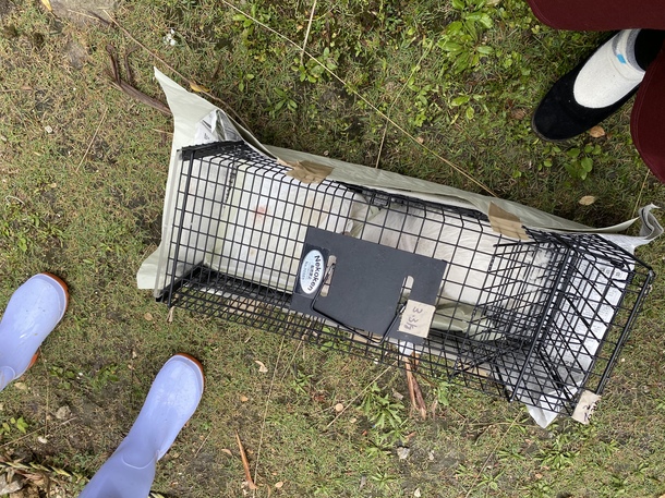 呼ばれて行って捕獲器設置 近くに潜んでいるのを確認しましたが、にがしてしまいました、