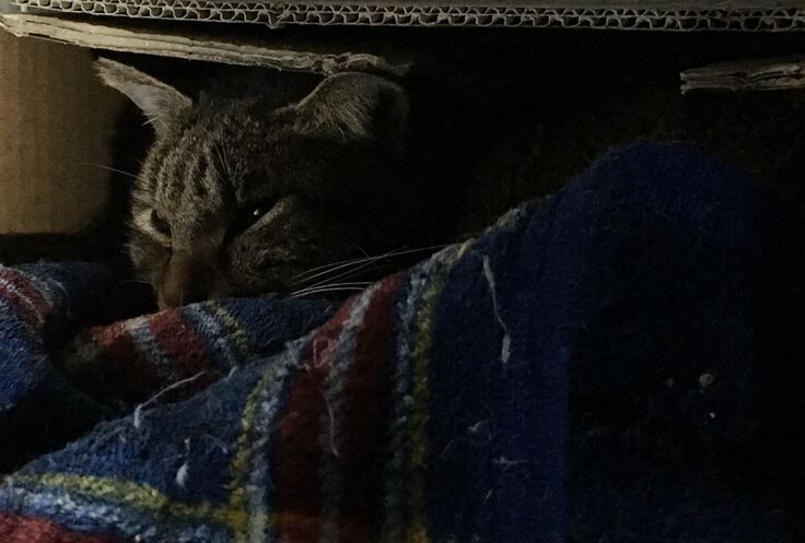 隠れ場所をみつけたようです。出てきてはだめだよ。