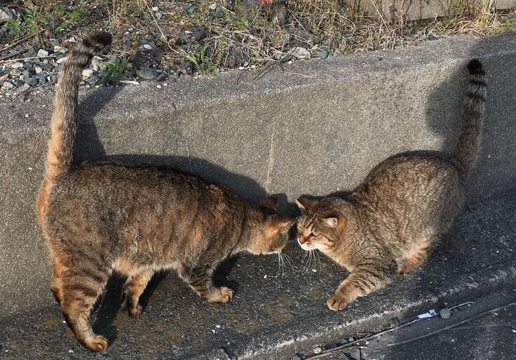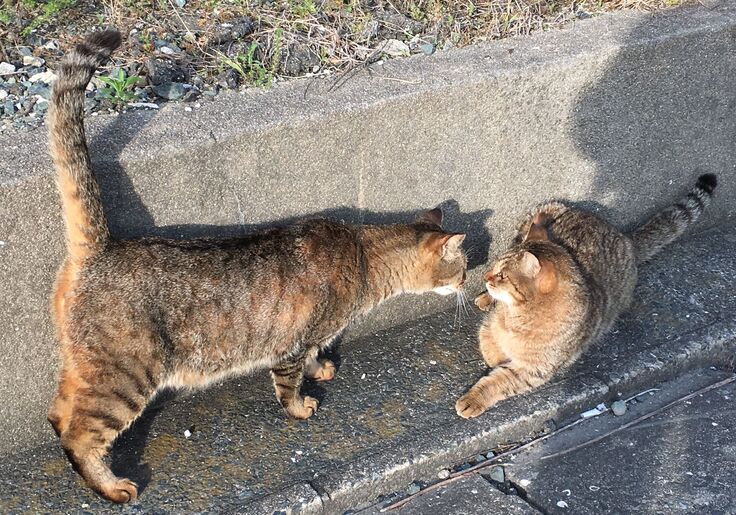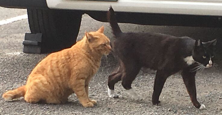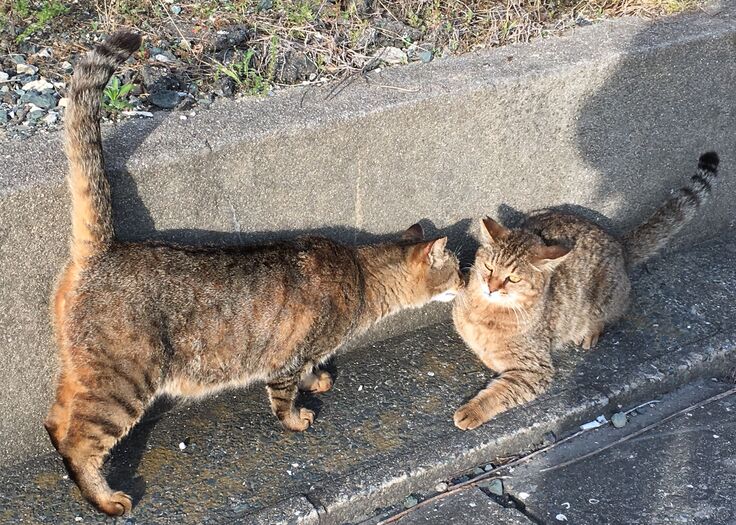 キャリーから出たぽぅちゃんが、若干ふらついた足取りで、キジ白の元に歩いていきます。