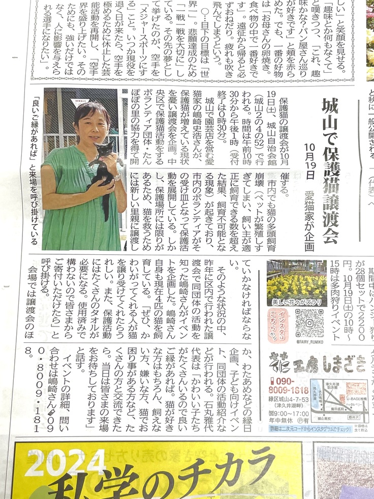 明日10/19、城山自治会館にて猫の譲渡会が開催をされます。そちらの紹介がされています。