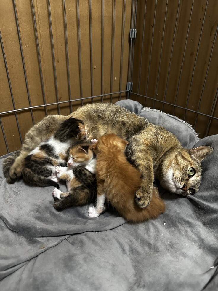 仔猫を連れてきてくれることを願ってご飯をあげ続けていました。ある日友人が様子を見に行った時に母猫がニャーっと近づいてきて「こっちに来て」と言っているかのように振り向きながら友人に向かって鳴き続けていて友人が母猫の後をついて行ったところ、微かに仔猫の鳴き声が聞こえてきたそうです。