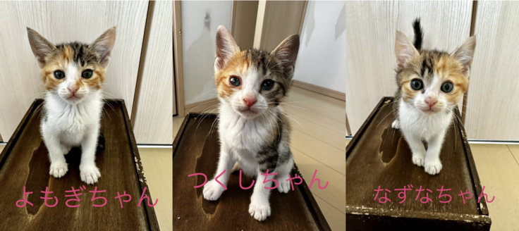 妊婦猫さんを保護し自宅にて出産(兄妹に男の子が1匹、里親さんに繋がりました)よもぎちゃんはクールな子、つくしちゃんは甘えん坊で私の前でコロンと寝そべってお腹を撫でてーとアピールします。なずなちゃんはとってもクール。でも本当は甘えん坊さん、ベタベタはしないけど気付くと近くにいてスリスリしてくれます。