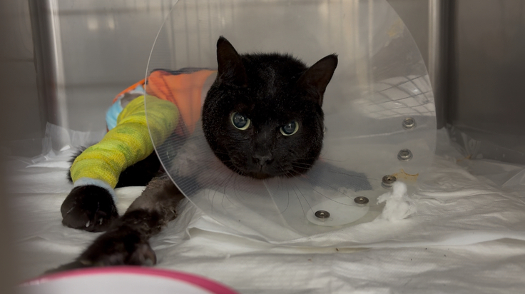 子猫の時から田んぼに遊びに行き、人に懐いてかわいがってもらっていたのですが、ある時網に足を絡ませひどい怪我をして手術。元々は小さな怪我だったのですが、術後に運悪く手術跡から細菌に感染してしまい、入院期間10ヶ月で合計7回の手術を受けました。るんを病院に連れて行ってくださった方は高額の医療費もお支払いいただいており、お見舞いにも足しげく通ってくださっていたのですが、手術を繰り返すの間にご自身がご病気になってしまい、引き取りができない状況になってしまったそうです。「るんの退院後の受け入れ先がなくなったことで安楽死を待っている」と担当の医師に聞き、すぐ保護に駆けつけました。