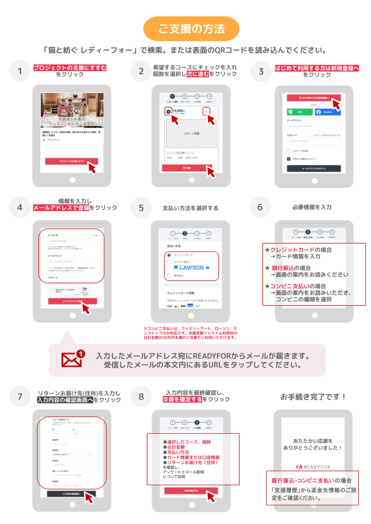 一方、操作方法が分からないという方からは、「代理支援」という形でのご支援も承っています。猫と紡ぐに直接ご支援金をお振込みいただき、猫と紡ぐが手続きを代行してクラウドファンディングに反映させるという方法です。