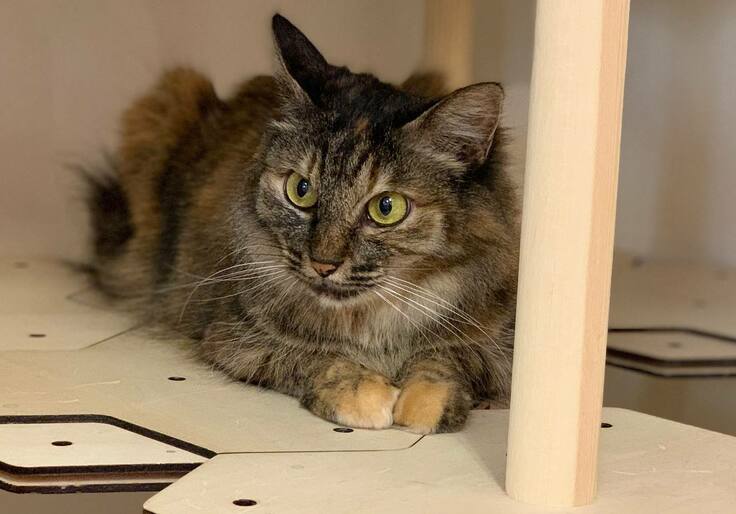 元気にフロアを飛び回って遊んだり、お客様がたに積極的に甘える若猫が多い中、『プラム』ちゃんはお部屋の奥の巨大キャットタワーが定位置でした。そんなお部屋の隅にいる『プラム』ちゃんに目が留まり、やさしくナデナデしてくれる優しいコが里親さんになってくれることが嬉しくてなりません。