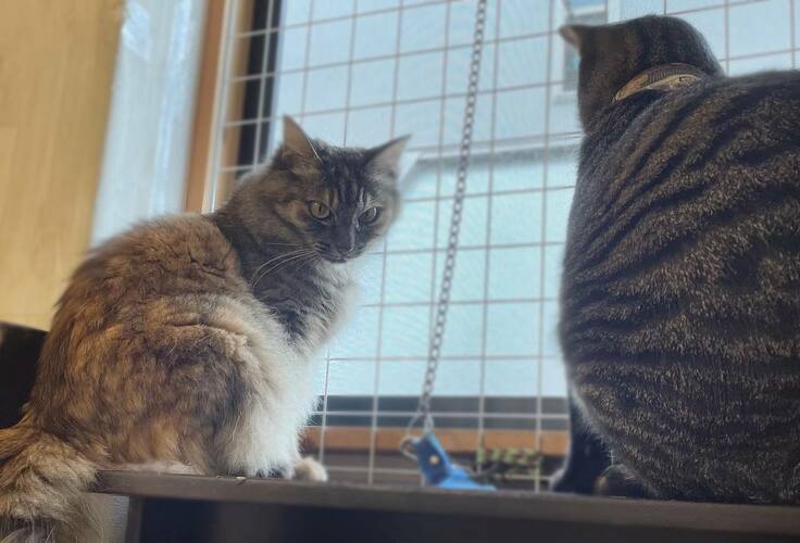 館に入居する前に、保護主さん宅から譲渡希望者宅へとお引越しました。ところがあまり幸せな環境ではなかったようで、飼育放棄の形で保護主さん宅へと戻って来てしまいました。出発時に3.15㎏あった体重がふたりして2.7㎏前後に減っていたことを、どう考えたらいいのでしょう。