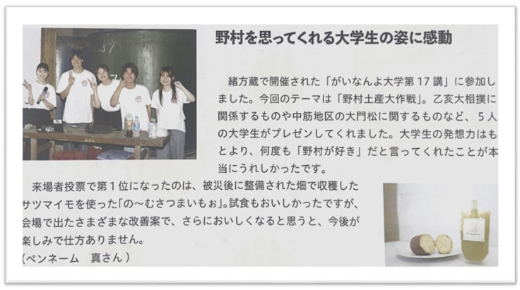 「大学生が野村に来る」、そして「野村のために何ができるのかと考えている」ことそのものを私たちが思っている以上に野村の方たちは喜んでくださっていたのです。
