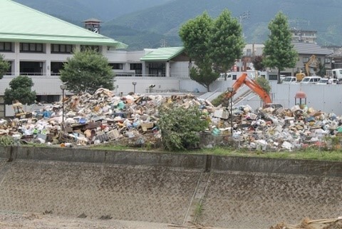 《乙亥会館の駐車場に災害ごみなどが集められている様子》
