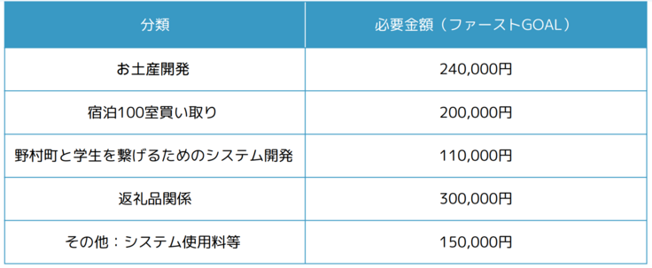 本プロジェクトで集まった資金は、お土産開発に24万円・宿泊施設100室買い取りに20万円・野村町と学生を繋げるためのシステム開発に11万円・返礼品関係に30万円・システム手数料に15万円使用します。 プロジェクト実施完了日までに、3つのシステムルールの作成・システムのモニタニング等、体制づくりに励みます。