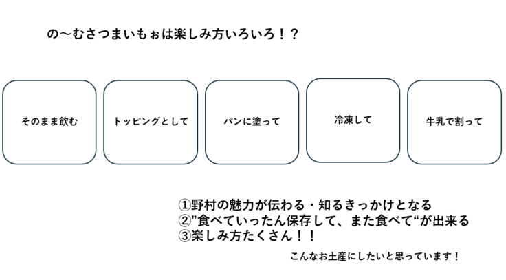 「野村の人が野村のお土産として地域外に持って行ったときに、野村を語ることができるお土産」を学生5名が提案し、プレゼンと試食会を行いました。