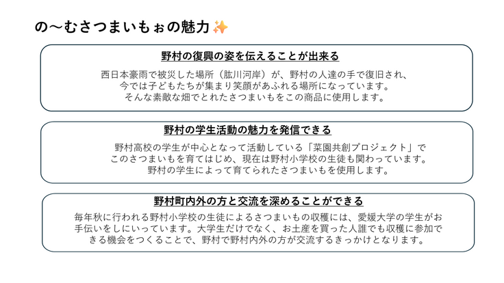 野村地域の方々によるお土産投票で1位になった、「の~むさつまいもぉ」をお届けします。肱川河川敷復興菜園で野村高校生たちが育て、野村小学校の子どもたちや私たち大学生も一緒に収穫したさつまいもを原料とした逸品です。