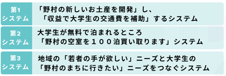 野村が「いつも大学生がやって来て大活躍しているまち」であり続けるよう、私たちが考えた「システム」は次の3つです。