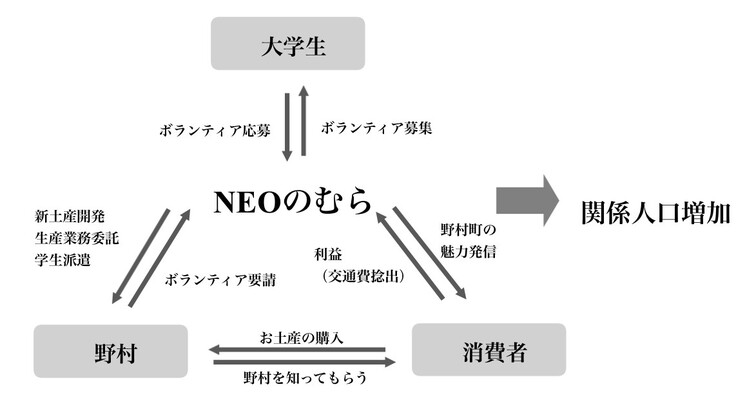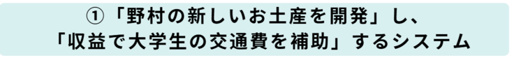 <「野村の新しいお土産」を開発し、「収益で大学生の交通費を補助」するシステム>