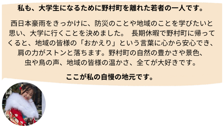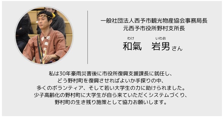 「何もないこの町に、よく来てくれたね」と声をかけてくださる地域の方々の温かい笑顔が、頭に浮かびます。「何もない」なんて、思ったことがありません。この町にしかない魅力を私達は沢山知っています。これからも野村の皆さんと関わり続けたい、その一心でここまで頑張ってきました。何としてでもこのシステムを実現し、野村町と大学生との繋がりを持続的なものにしたいです。そして、もっと沢山の学生にこの町の虜になってもらいたいです。どうか、応援よろしくお願いします。