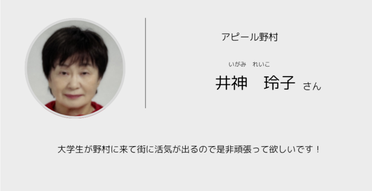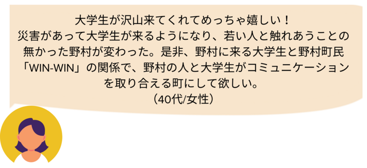 「大学生は、大人と子どもの間の存在。子どもが何かをしようとしたときに大学生が橋渡し的な役割をしてくれるのではないかと期待しています」(野村住民の方より)