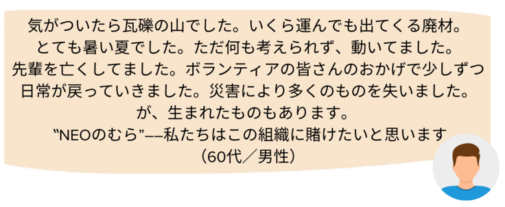 この災害をきっかけに結成されたのが、一般社団法人「NEOのむら」です。