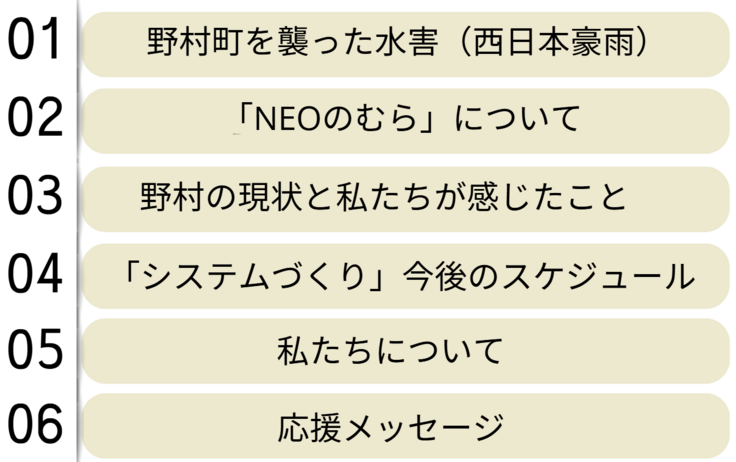 しかし、2018年の西日本豪雨災害をきっかけに「NEOのむら」が結成され、 その後野村町を訪れる大学生は増え、昨年度はのべ100人以上が野村を訪れました。