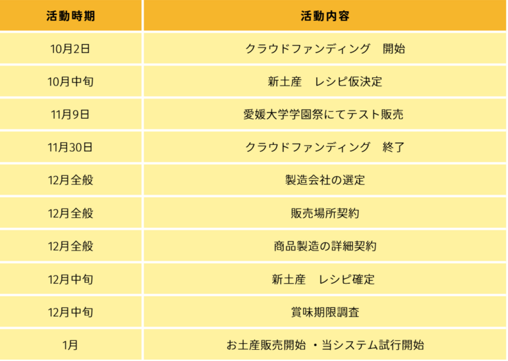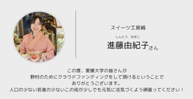 これを第1弾として、今回クラウドファンディングでのご支援をもとに「お土産による売り上げで大学生が野村町に行き、そこで大学生が活躍する」システムを実現させます。