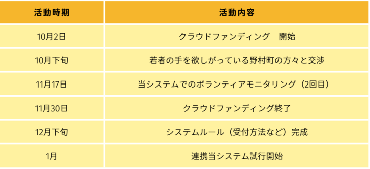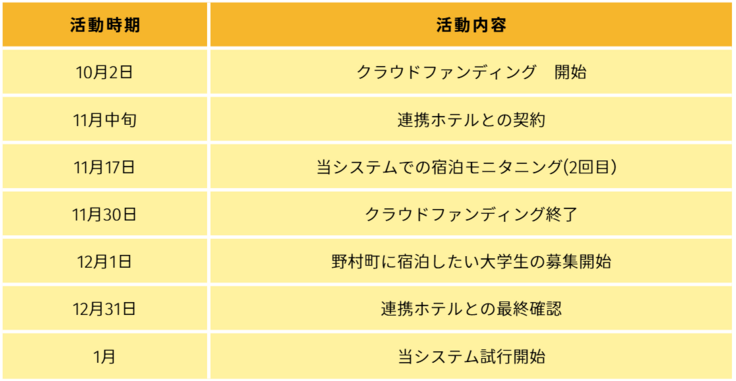 ほか、内容は幅広く「町民の方々」「大学生」それぞれ両方のニーズ開拓を目指します。 また学生のアルバイト旅やサークル合宿と兼ねてこの制度を利用してもらえればと考えています。