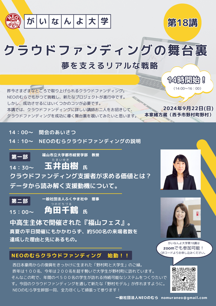 データを用いた説明で、クラウドファンディングそのものへの知識を深めることができました。どのような方が支援してくださるのか、という支援者の傾向や、クラウドファンディングの課題など、私たちNEOのむらが今後活かせるようなことが多く学べました。