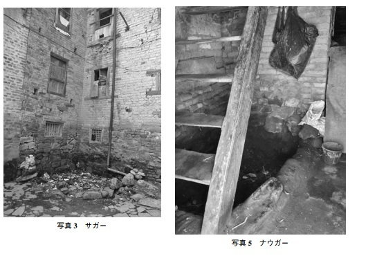 都市におけるネワール人の住居は、隣接する家々が密接して建てられており、多くの場合、住居には家庭からでる「ごみ」を捨てる「穴」があった。サガー(Sa : Ga : )、ナウガー(Nau : Ga : )と言われるその穴は、単にごみを捨てる場所ではなく、肥料をつくり田畑へと還元する生活システムの一部であった。(論文より一部抜粋)