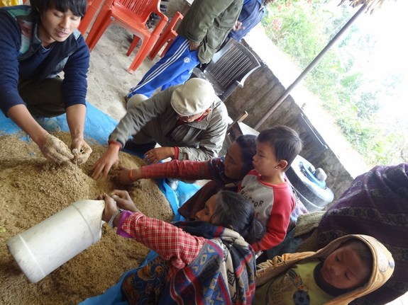 1週間前に仕込んだ高倉式コンポスト種菌液を麦柄と米ぬかに混ぜる工程を皆で一緒にやりました。