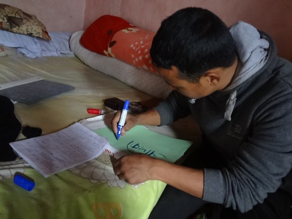 12枚のシートのあらすじを考え、日本語で書き留めたものをアカスにネパール語に訳してもらいました。