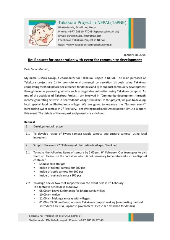 本日ネパール調理師協会に提出した協力要請書の内容をご紹介します。明日の午後理事会で協議され、金曜日の朝9時までに、調理師協会としてどういう形で協力するかの決定がされます。