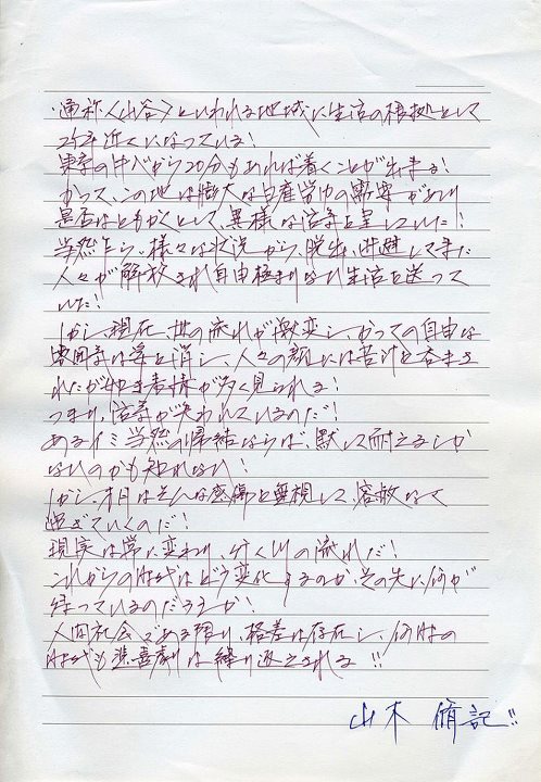 これは山谷に40年程住んでいた方に書いてもらった手記である。彼の素直な心の声。元々某名門大学の法学部を出て、工場を経営していたのだが、オートメーション化の波に負けて山谷に来た。現在は17年間抽選のくじを引き続けて、都営住宅で暮らしている。
