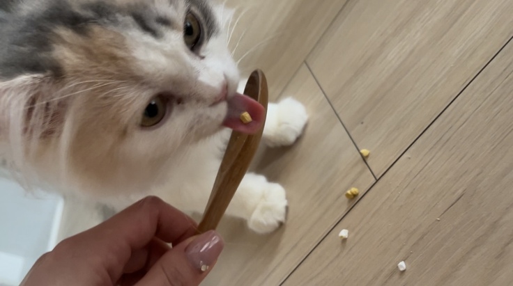 朝イチの空腹時、投薬後30分経ってからご飯をあげるようにしています。