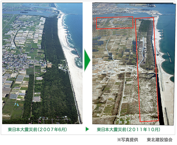 (震災前後の比較写真、亘理町吉田東部の沿岸部)