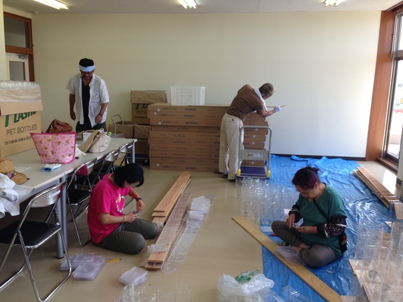 これは2Lのペットボトルの上部を切り取り、キャンドルを中に取り付けたものです。板に貼り集合させるとこのような明るさになります。この写真は今年8月に亘理町で行われた灯篭流しの際に、慰霊の意味を込めて作られた文字です。こちらのキャンドルを町内のまちづくり協議会がご厚意で貸して下さる事になりました。