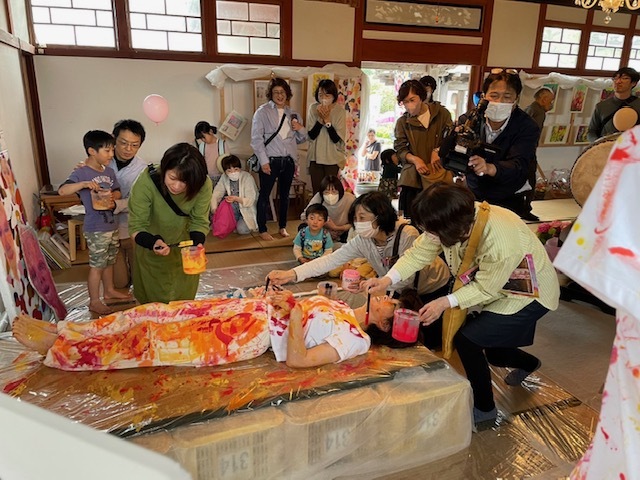 亡くなった人という設定で横たわり、来場者に色を付けてもらうアートパフォーマンスです。ここでは来場者がアーティストです。