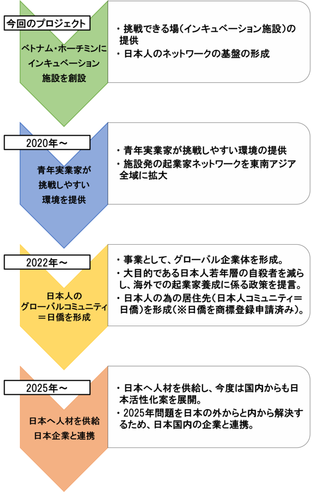 将来的には、東南アジア・ベトナムに日僑なる長期的な人的及び企業ネットワークを作り、今回のプロジェクトの対象者の若者には、先ずは日越及び、日対東南アジア諸国の為に成長して欲しいと考えています。