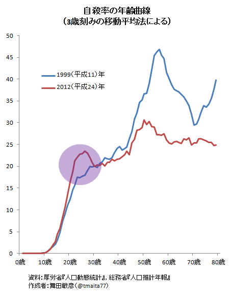 下記の表は1999年と2012年の年齢別自殺率を表したものです。