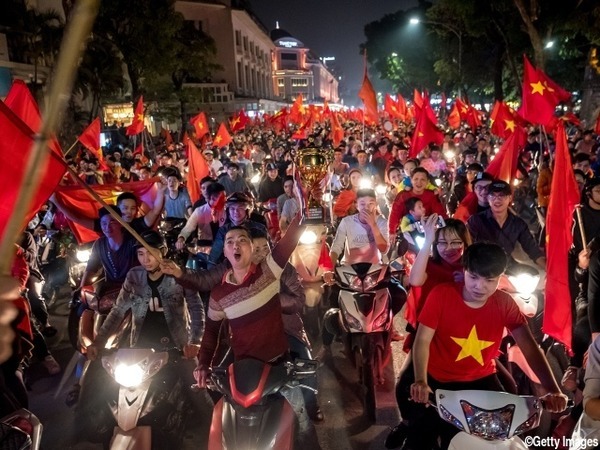 若者が国旗を振り喜びを爆発させる。どっかの国では国旗を振ると政治的思想を指摘される・・・憂国JAPAN・・・本日27日は決勝戦!頑張れベトナム!