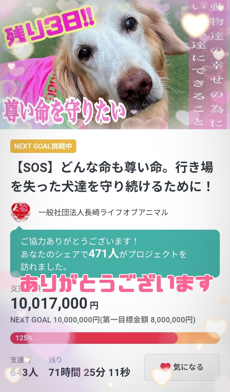 みなさんからの応援コメントをひとつひとつ見させていただき、私たちができることは限られているかもしれない…すべては救うことはできない…でも一般社団法人長崎ライフオブアニマルとして、これからも全力で犬猫たちを守り続けます👊👊